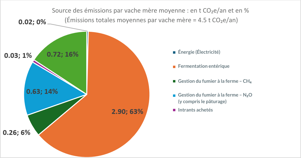 Une vache allaitante émet en moyenne 4,5 t de CO₂e par an. Il ressort que, outre la digestion – responsable de 2,9 t de CO₂e/an (63 %) –, la gestion des effluents (14 %) et l’autoproduction de fourrage (16 %) jouent un rôle déterminant dans ce type d’élevage. L’énergie (électricité) a un impact négligeable dans cette branche de production.